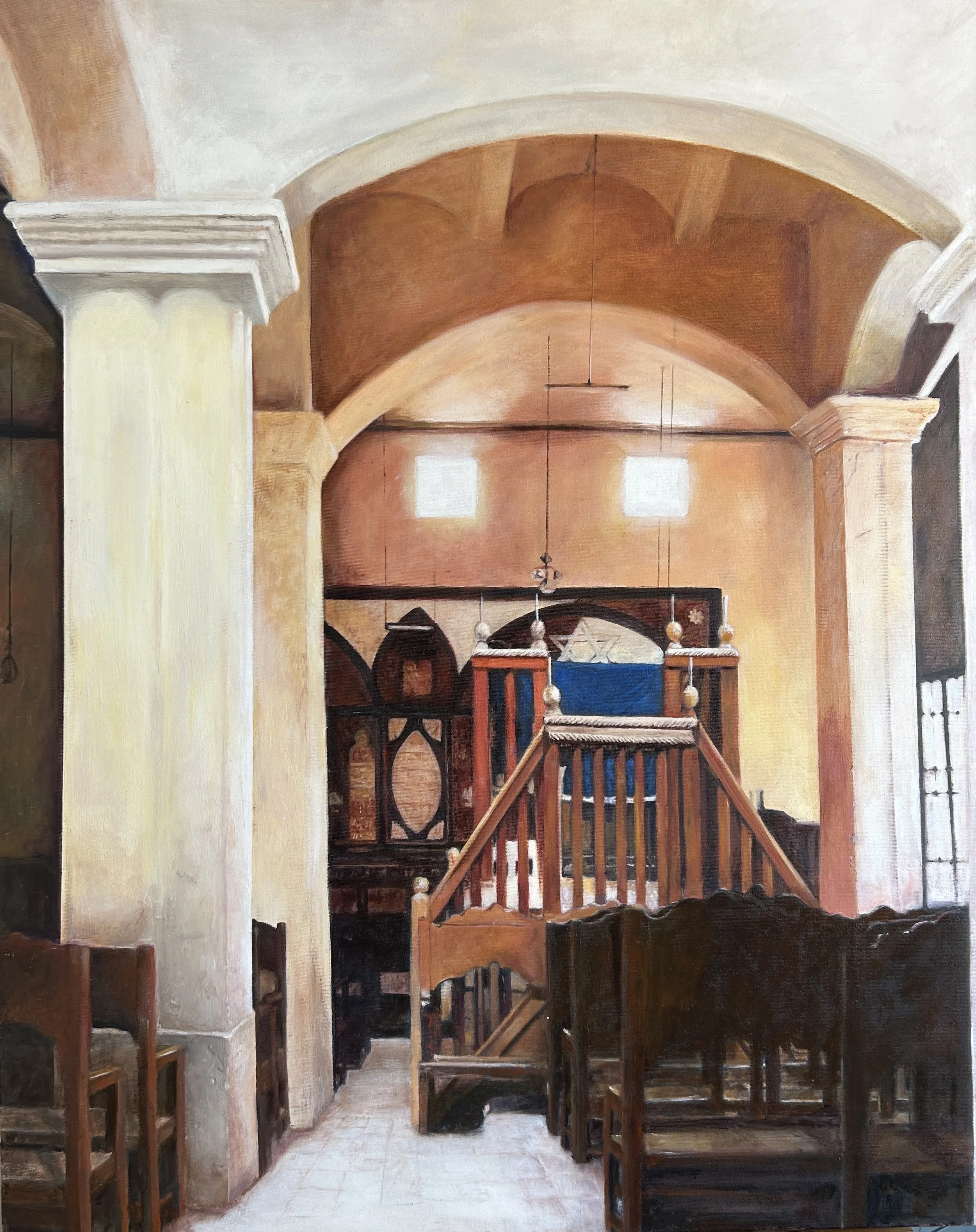 Usually I like to draw from a clear picture but this time I agreed to draw the interior of the Great Synagogue of Gardaya from an old blurry black and white photograph. From the moment the client showed me the picture I felt drawn to this special place. In each commissioned painting, I research the environment and history of the subject of the painting, and this time I set out on a fascinating exploration.